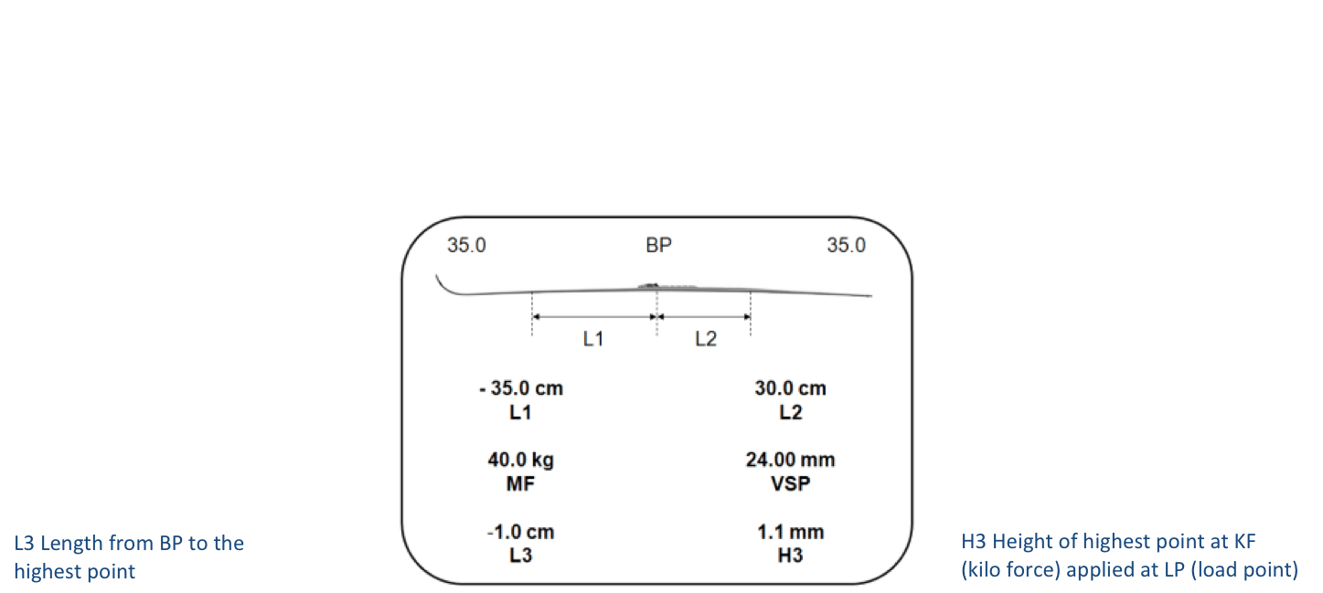 This means you will go backward exactly 30.0cm from the balance point on this ski until you reach a point behind the balance point that is 0.2mm above the surface. We do this for two reasons. One, this makes sure that both skis within a given pair are perfectly matched. And two, we have established distances fore and aft from the balance point that we want each model and each length of ski to meet when it comes to being 0.2mm above the surface. This is a very effective way to measure quality control and to make sure the skis have the desired flex. You will notice the next row of numbers begins with 40.0 kg over MF. The MF stands for Mid Flex. This means at 40.0 kilos of weight this particular ski is 0.2mm from bottoming out. We use this measurement as the primary basis for fitting skiers and we also use it to make sure that both skis within a given pair have identical flexes. The next number to the right, in this case 24.00mm, is the VSP height and it refers to how high the ski is when unweighted. The bottom number on the right is the L3. This tells us how far you have to go from the balance point to reach the highest point of the ski. The final number in the lower right hand corner is how high the ski rests above the surface with 35 kilos of pressure.