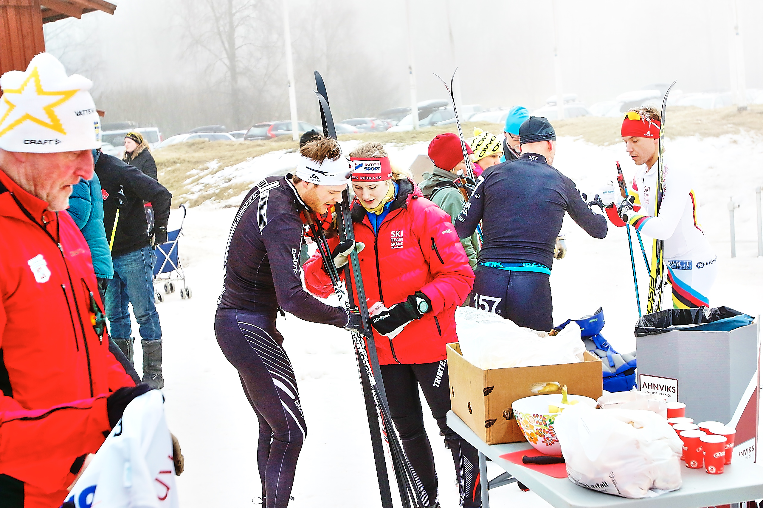 Simon Grenlöv gjorde ett fantastiskt bra lopp och blev 6:a. Riktigt kul att se. Där inspekterar han skidorna med Marika Sundin, som hejade friskt under loppet.