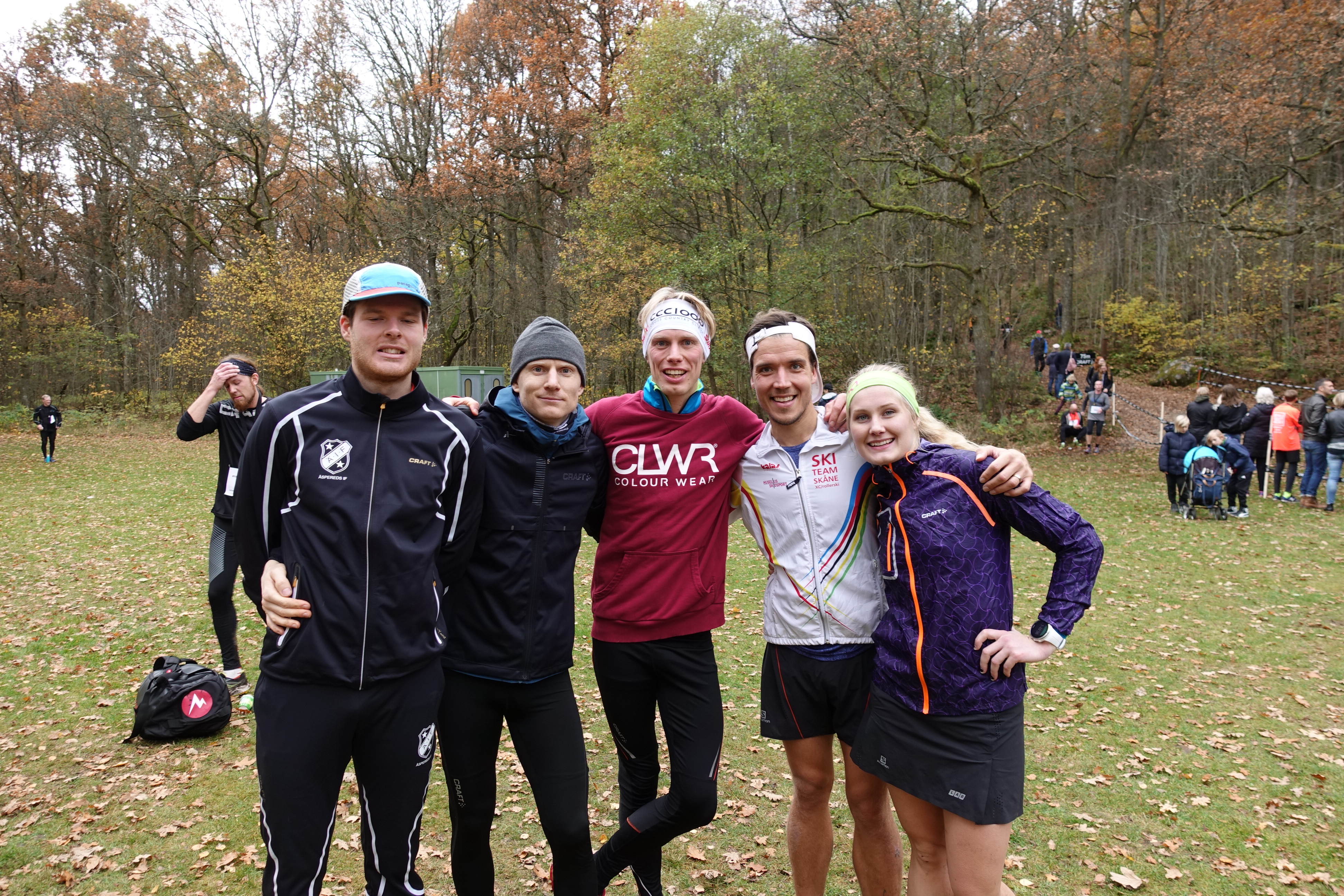 Simon Grenlöv, Martin Damm, Erik Wickström, Rickard Bergengren och Marika Sundin efter Rya Åsar Trail Run 2017